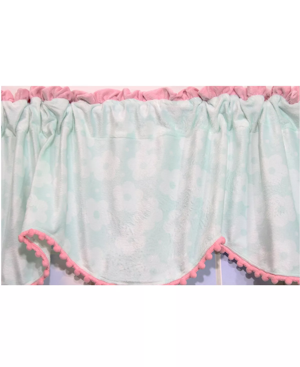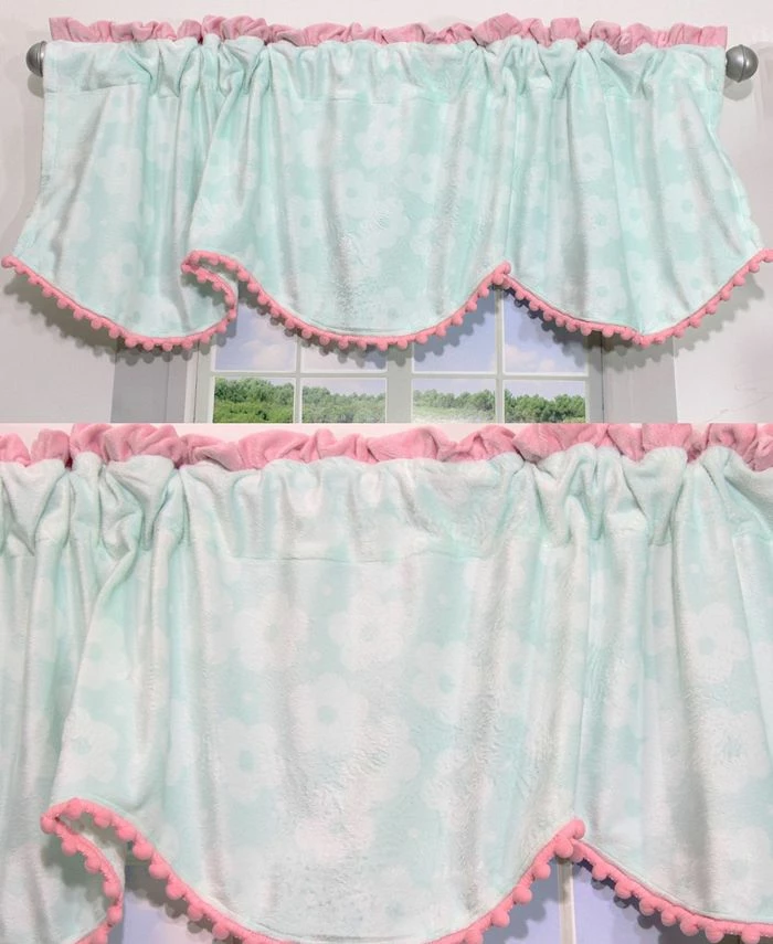 Bonus 2 Pack will take care of both windows in the nursery. The Butterfly Wings valance is uniquely shaped in printed velour and finished in a pink pom pom style trim. Aqua floral print with pink trim. Looks great in any room of the house – not just the nursery.