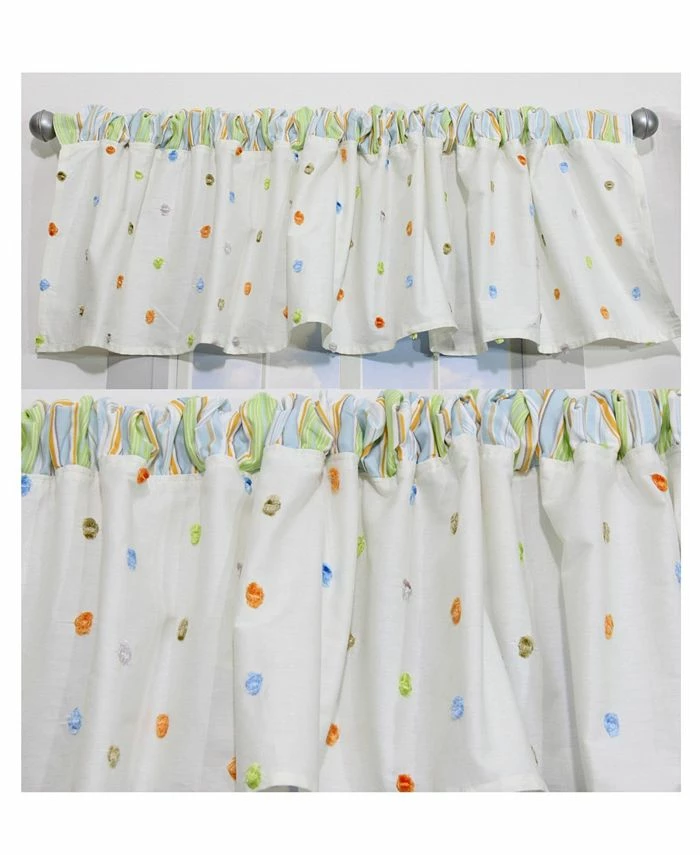 - Mix and matchable window valances are ivory twill with a dimensional cut embroidered dot, trimmed with a striped twill