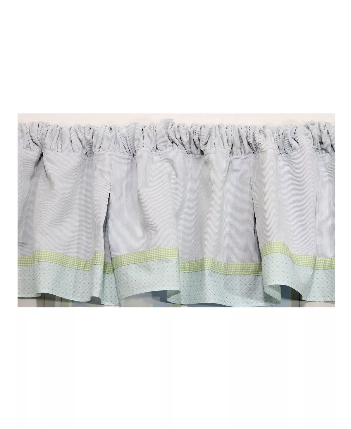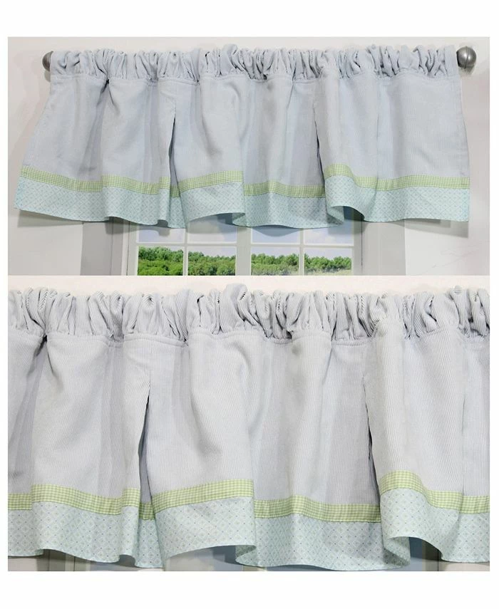 - Mix and matchable window valances are blue corduroy, trimmed in green gingham with a blue geometric print border