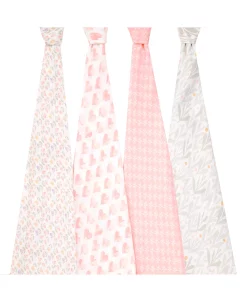 This 4 pack set of swaddles is made from cotton muslin. Breathable, versatile and soft as a mother’s touch. No matter how you are using our swaddle- stroller cover, burp cloth or nursing cover to name just a few, it surrounds your little one in comfy goodness round the clock.