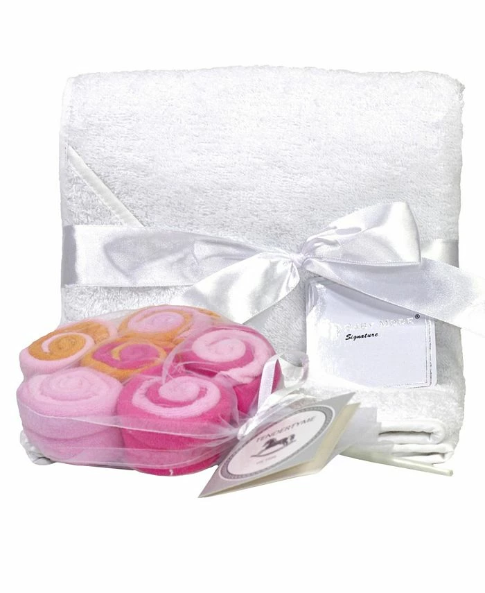 This 13 piece gift set for baby will be useful, practical, warm and soft. The terry cloth hooded baby towel will wrap your bath in warmth and comfort. The super cute lollipop is made from 12 separate washcloths fashioned into 6 separate flower petals. White hooded towel with various pink washcloths.