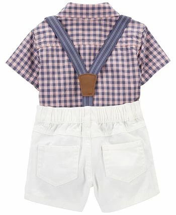 Dress up your handsome one in this 3-piece set, complete with a plaid button-front bodysuit, twill shorts and coordinating suspenders.
