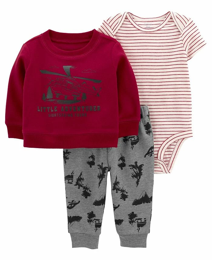 Stock up on three cute pieces, including a fleece cardigan, short-sleeve bodysuit and a pair of easy on pants.