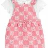 - Coverall: square neckline; straps; pocket at front; snaps at bottom