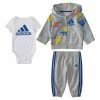 Made to match, this set of three is complete with a zip-up hoodie, short-sleeve bodysuit and a pair of coordinating pull-on pants.