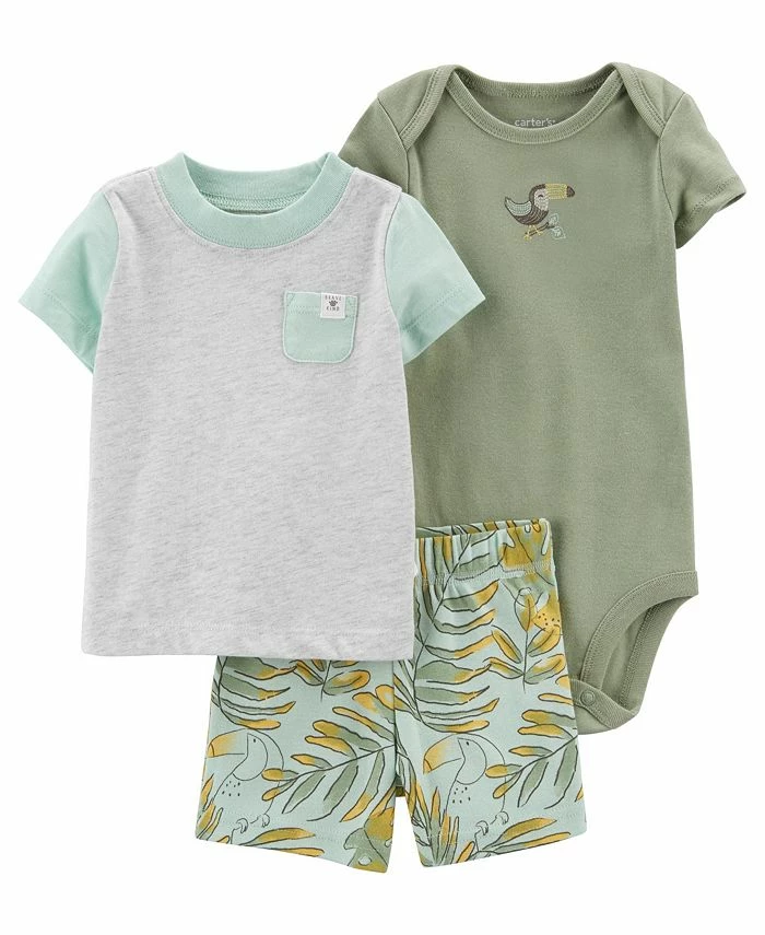 Crafted in soft cotton with three pieces in one, this set is complete with a short-sleeve T-shirt, toucan bodysuit and a pair of matching tropical shorts.