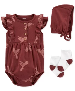 A sweet bonnet and a pair of socks are the perfect finishing touches to this flutter-sleeve bodysuit from Carter’s.