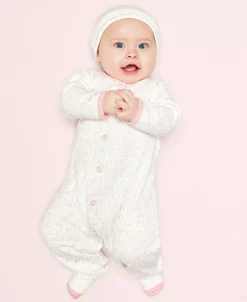 - Three-piece set of a coordinating onesie, a pair of socks and a cap