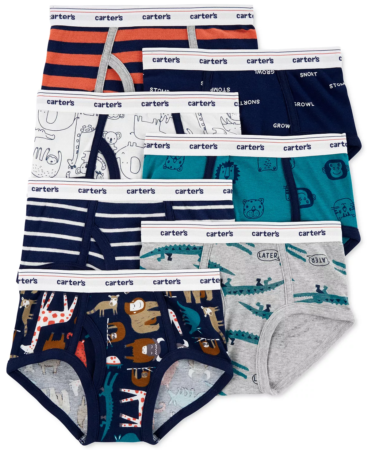 A week’s worth of fun comfort. Stripes combine with animal prints on this 7-pack of cotton briefs from Carter’s.