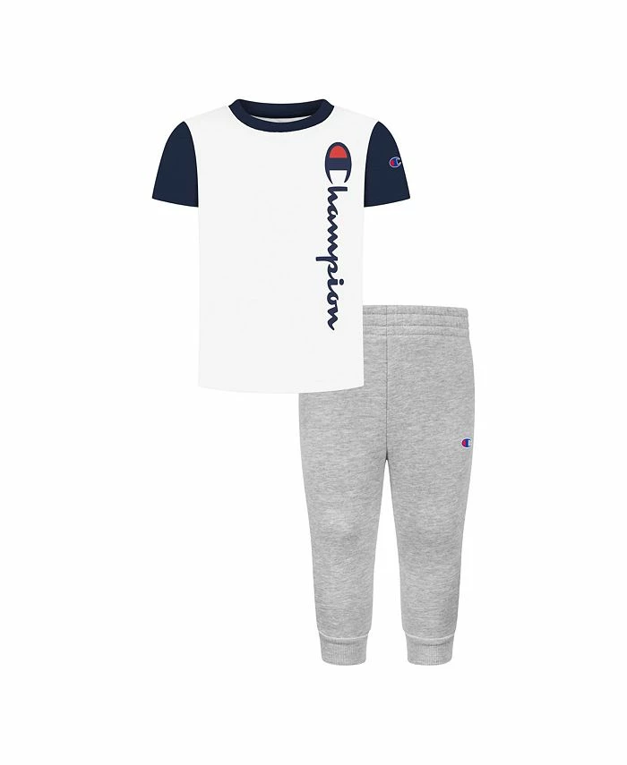 Grab your little Champion and get them in this essential signature script Champion color blocked signature T-shirt and fleece joggers set. The set includes the brands signature script short sleeves color blocked T-shirt and coordinating fleece joggers. Perfect for any occasion.