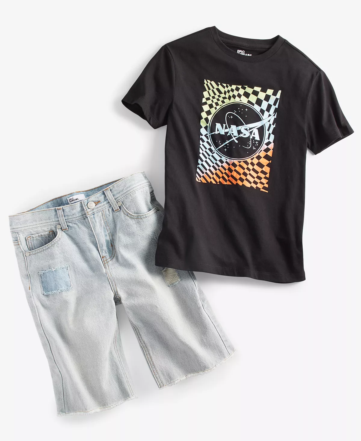 Take his style out-of-this-world with these separates from Epic Threads, featuring a Nasa graphic T-shirt and denim shorts.