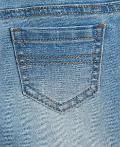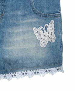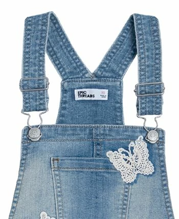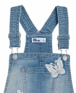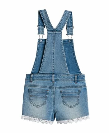 Lace appliques and details add a delicate feel to this stylish denim shortall from Epic Threads.