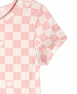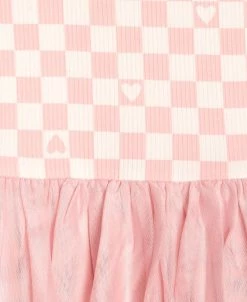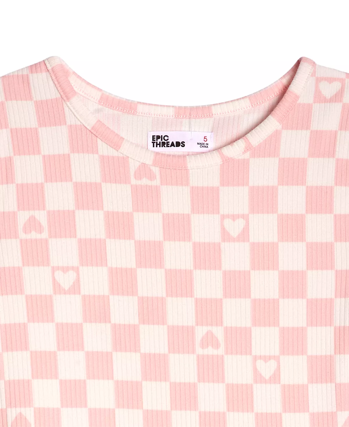 - Checker print with hearts on body and sleeves
