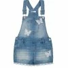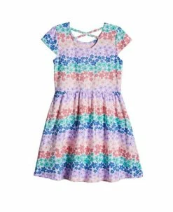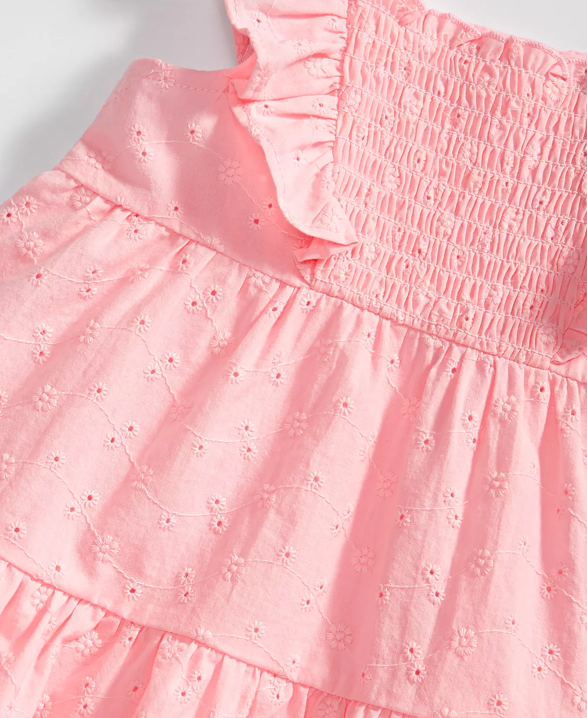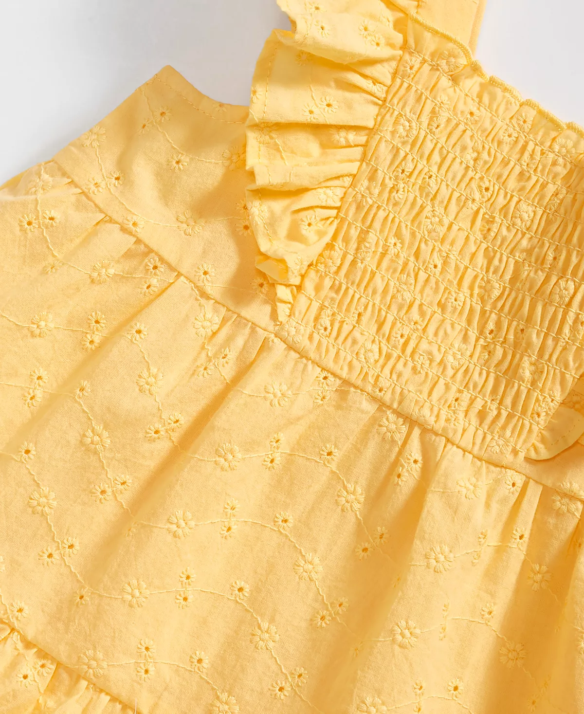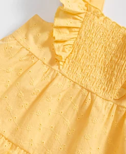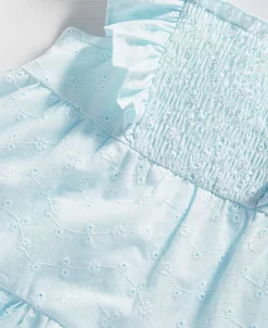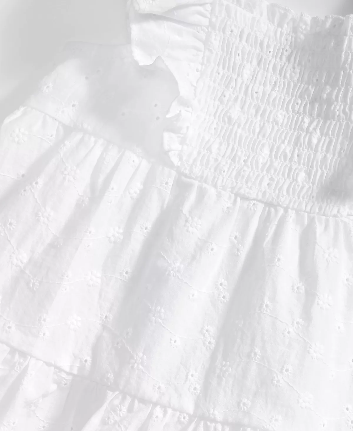 - Top: square neckline; short flutter sleeves; pull-on style; three functional buttons on back; tiered style; eyelet details