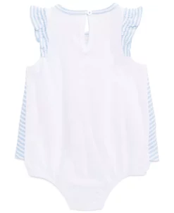 She’ll be casually cute and effortlessly charming in First Impressions’ striped sunsuit, featuring a skirted front and sweet bows.