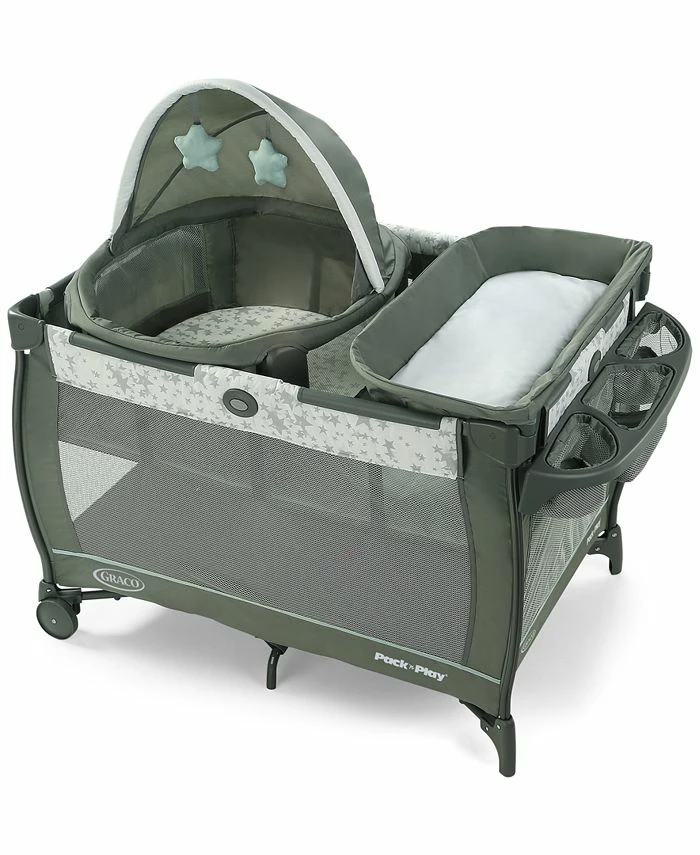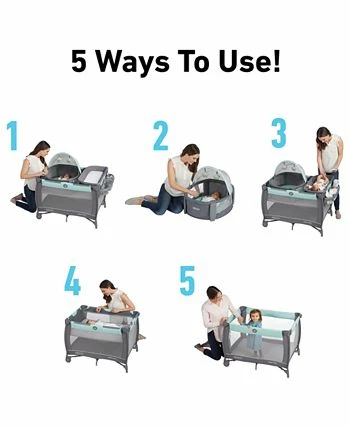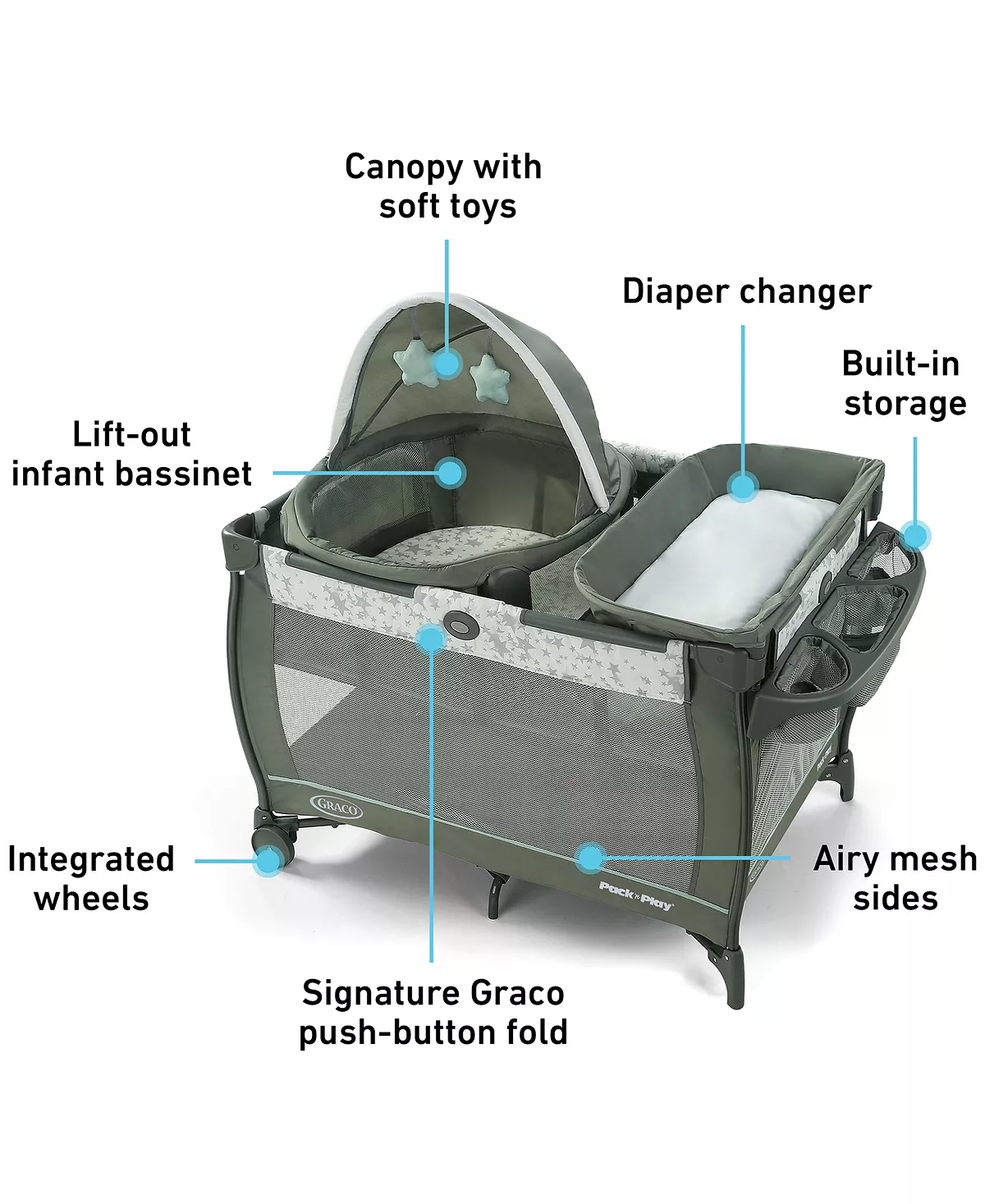 Graco’s Pack and Play travel dome Play Yards includes a travel bassinet that can be used in or out of the Play Yards and it transitions to a full-size bassinet and spacious toddler Play Yards for your growing baby.