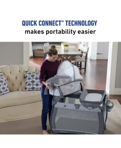 - Thanks to Quick Connect Technology, accessories remove from the playard quickly for easy portability around the house and effortless pack up