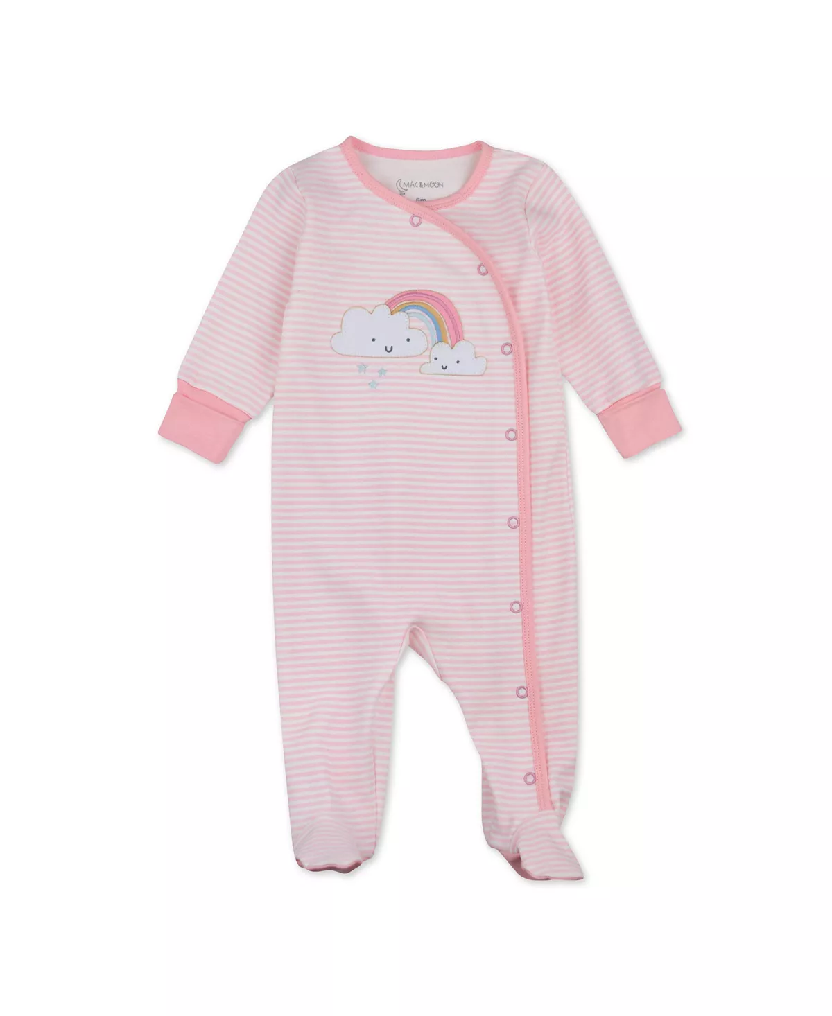 From sleep and play and everything in between, our footed sleepsuit is made from 100% cotton and keeps baby comfy all day long. This sleeper is in a mini stripe with a beautiful rainbow graphic on the front.