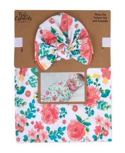 Baby Essentials Girls Soft Floral Print Swaddle Wrap Blanket With Matching Turban, 2 Piece Set