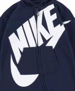 Go for an adorably sporty look with this soft Nike French terry coverall featuring a Futura logo graphic and a comfy hooded design.