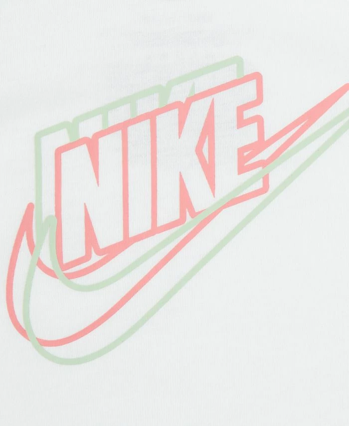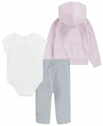 For comfy indoor days or playing outside, this cute set is a wardrobe essential for every baby girl. Featuring a cozy zipped hoodie, a super soft bodysuit with graphic Nike logo and body-hugging stretch leggings.