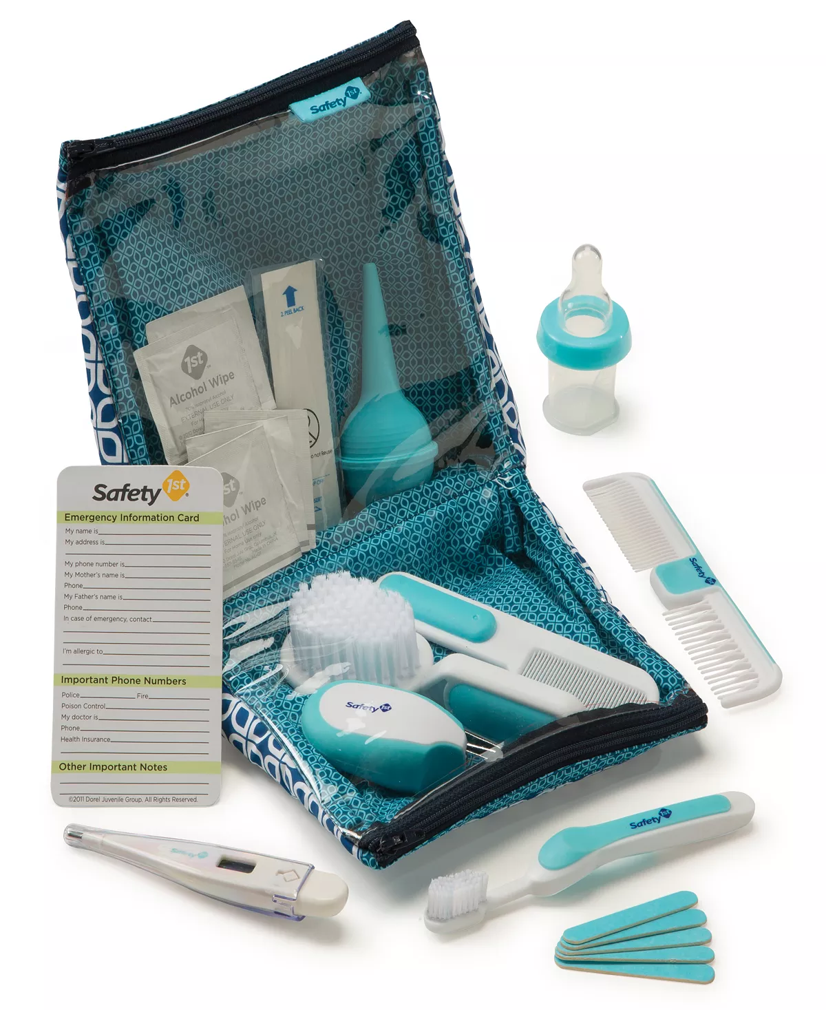 The Deluxe Healthcare & Grooming Kit by Safety 1 gives parents a convenient all-in-one kit containing a full assortment of baby essentials that are great to have along when on the go. This deluxe assortment includes a 3-in-1 thermometer with protective case; a toddler toothbrush with a chunky, easy-to-hold handle; a bottle medicine dispenser that lets you give baby medicine in a comforting, familiar way; and much more. The wrapping clutch case with zippered, clear-view compartments helps you to easily keep things where you can see them and get to them quickly. Toss the case into your diaper bag and it’ll be there when you need it.