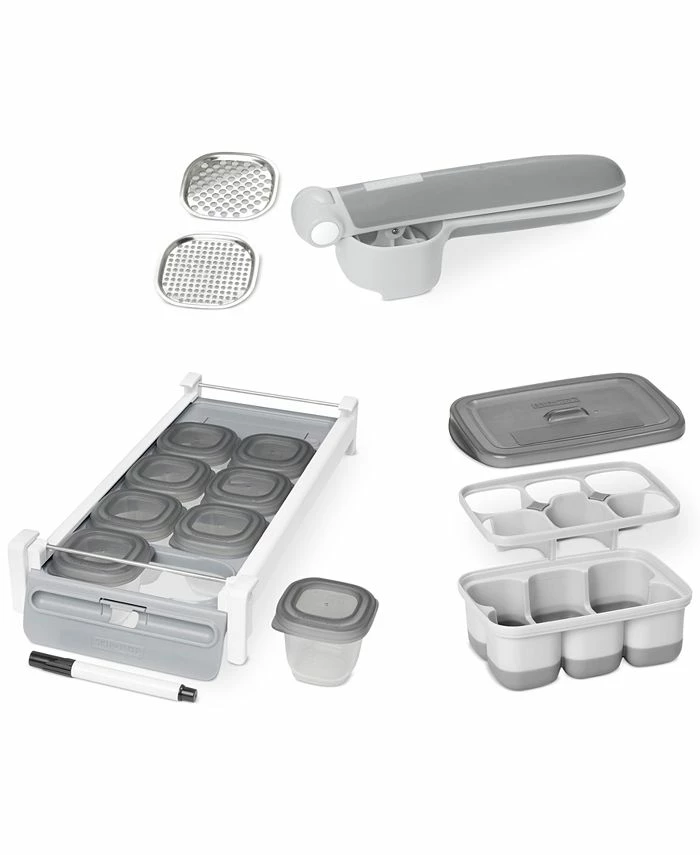 You’ll get three essential time-saving tools at once with Skip Hop’s starter kit. Create your own fresh baby food with the food press baby puree maker, then store it in the sliding tray and baby food containers or freeze a fresh batch of baby puree for later in the freezer tray set.