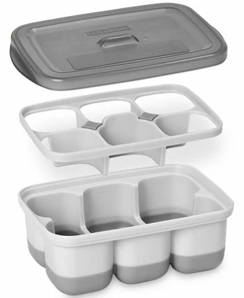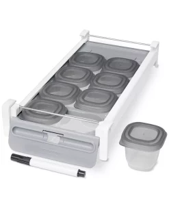 - Clip-on sliding tray for fridge or freezer with 8 (2 oz.) baby food storage containers with lids