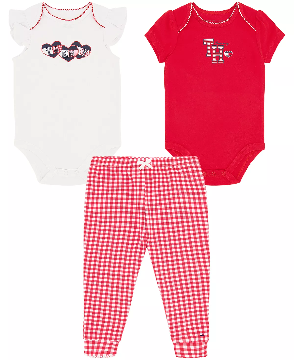 Essential comfort for every day, this set from Tommy Hilfiger includes two signature bodysuits to coordinate with accompanying gingham knit joggers for an adorable look.
